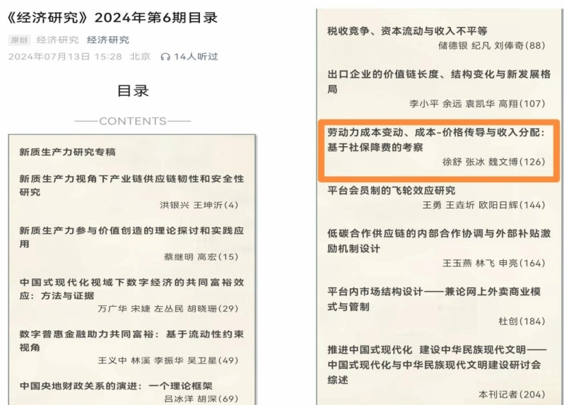 我校经济学院2017级西方经济学博士生张冰(2023年毕业后任安徽财经大学财政与公共管理学院讲师)及2018级西方经济学博士生魏文博,在导师徐舒教授的指导下,合作完成的学术论文《劳动力成本变动、成本—价格传导与收入分配:基于社保降费的考察》在《经济研究》2024年第6期刊出。