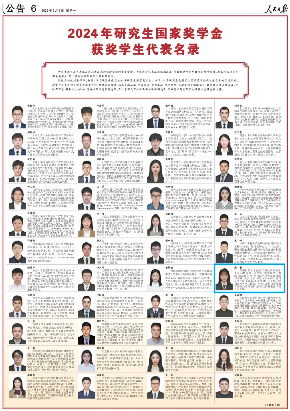 5月5日,《人民日报》专版刊登《2024年研究生国家奖学金获奖学生代表名录》,展示了研究生国家奖学金获奖学生中的100名优秀代表的风采。我校经济学院政治经济学专业2022级博士研究生唐湘光荣上榜。