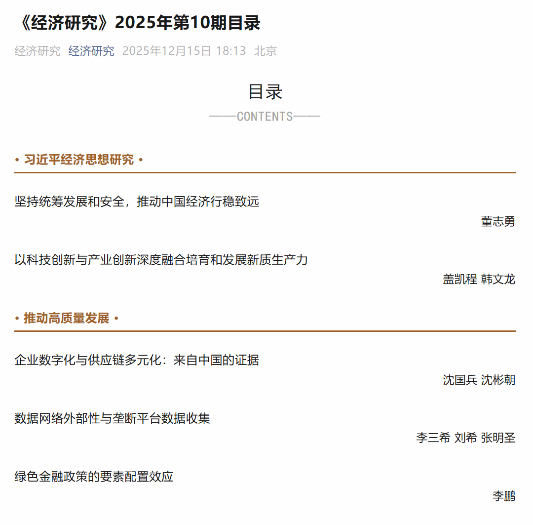 近日,我校国际商学院2022级国际贸易学专业博士研究生陈星达和国际商学院蒋为教授、中国西部经济研究院倪诗程讲师(通讯作者)共同撰写的论文《人工智能、产业结构转型与跨越“中等收入陷阱”》在《经济研究》2025年第10期刊出。