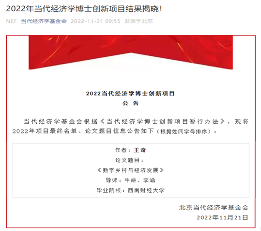 11月21日,“当代经济学博士创新项目”2022年资助名单正式揭晓。我校经济与管理研究院2021届博士毕业生王奇同学在牛耕副教授和李涵教授的共同指导下,凭借聚焦中国经济问题和中国发展经验的《数字乡村与经济发展》从全国高校推荐的百余篇经济学博士论文中脱颖而出,获此殊荣。