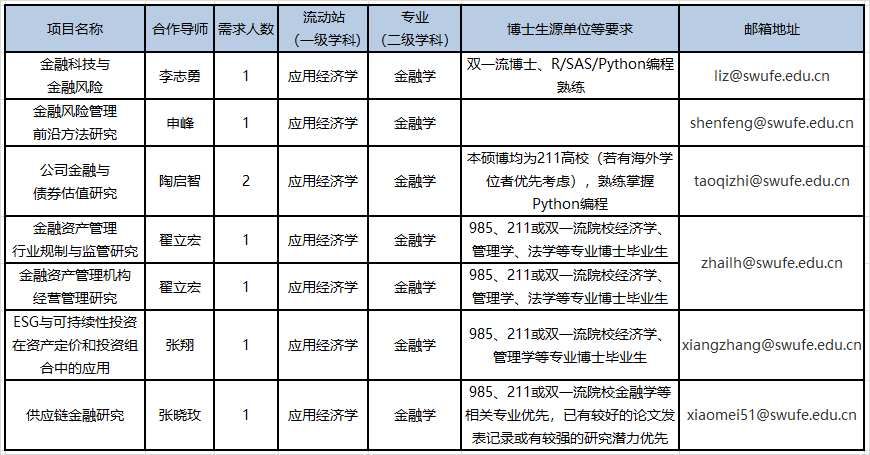 请于2021年11月10日前将申请材料通过电子邮件提交至意向合作导师的邮箱。邮件主题请注明:应聘博士后+姓名+单位或毕业院校。申请材料恕不退回。入站程序及相关信息参见西南财经大学研究生院主页博士后专栏。